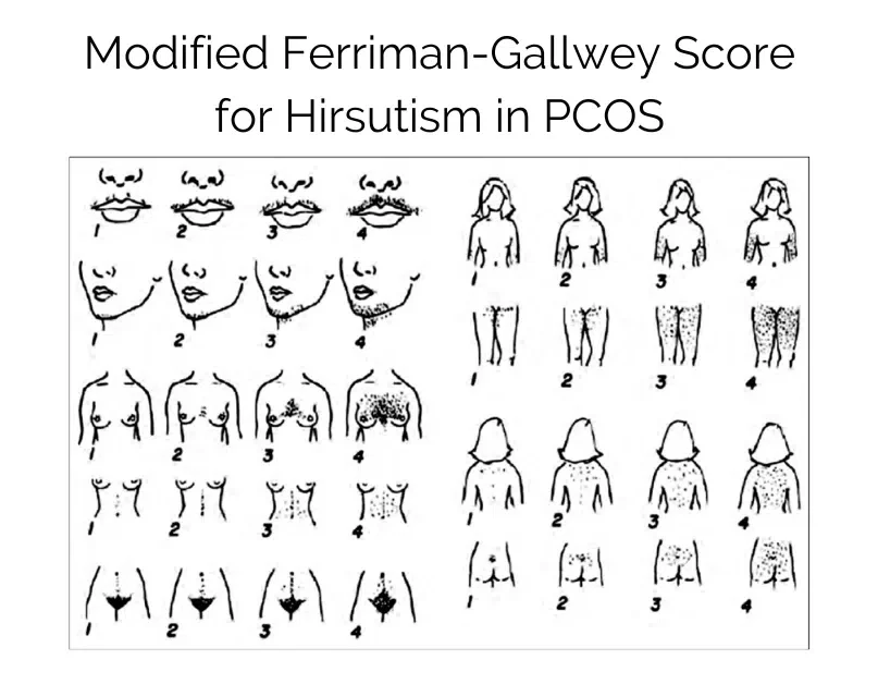 Is a clinical tool used to assess the severity of hirsutism by measuring hair growth in specific areas of the body that are typically sensitive to androgens or male hormones. This scoring system is commonly used to help diagnose conditions like polycystic ovary syndrome (PCOS) and other hormonal disorders that can cause hirsutism like Cushing's syndrome or adrenal hyperplasia. Insulin resistance and some medications can also have an impact on hair growth.